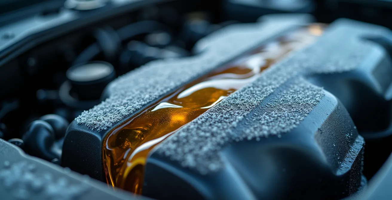 The most critical moment for your engine in winter is the first few seconds after a cold start. At -30°C, conventional motor oil doesn’t just get thick; it essentially turns into cold molasses. This high viscosity means the oil pump struggles to circulate it, leaving vital engine components, like bearings and valvetrains, momentarily unlubricated. This is where the majority of engine wear occurs, a slow and silent killer that shortens your engine’s life with every freezing start. Conventional and synthetic blend oils simply take too much time to flow smoothly through the engine in these conditions.